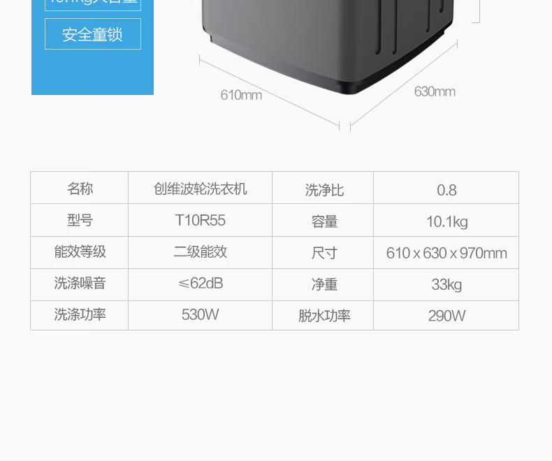 创维洗衣机 T10R55_钛金灰 10KG 智能 彩色面板 一键智洗8档水位调节