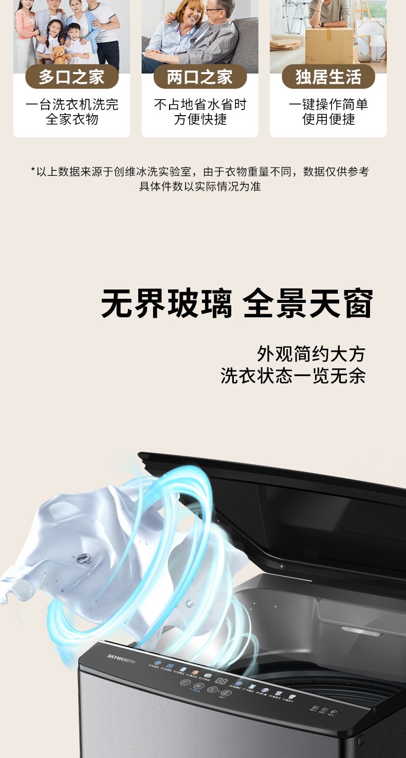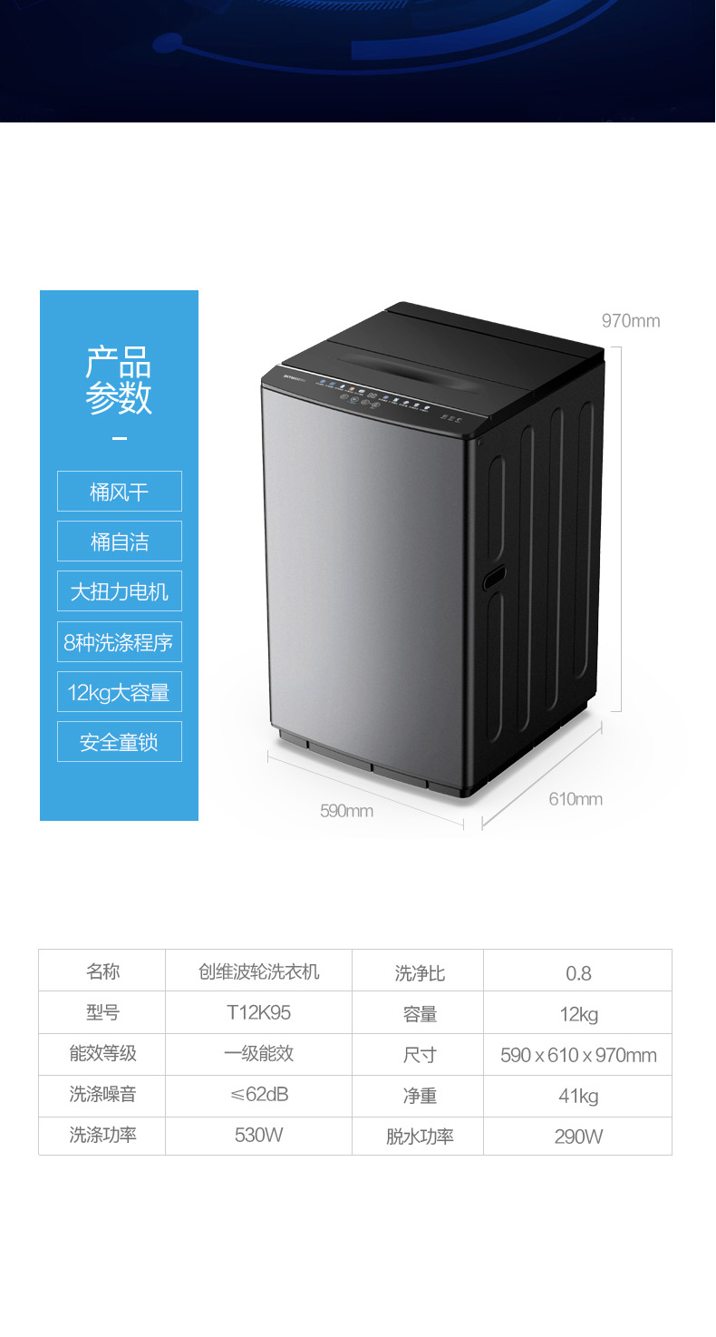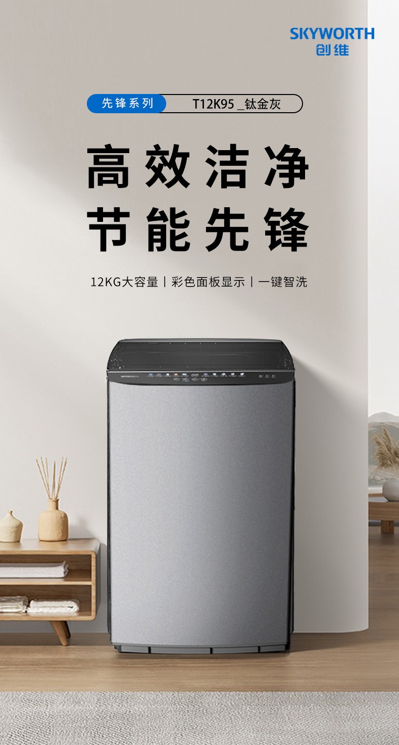 创维洗衣机 12KG波轮 彩色面板显示 一键智洗 筒自洁 T12K95_钛金灰