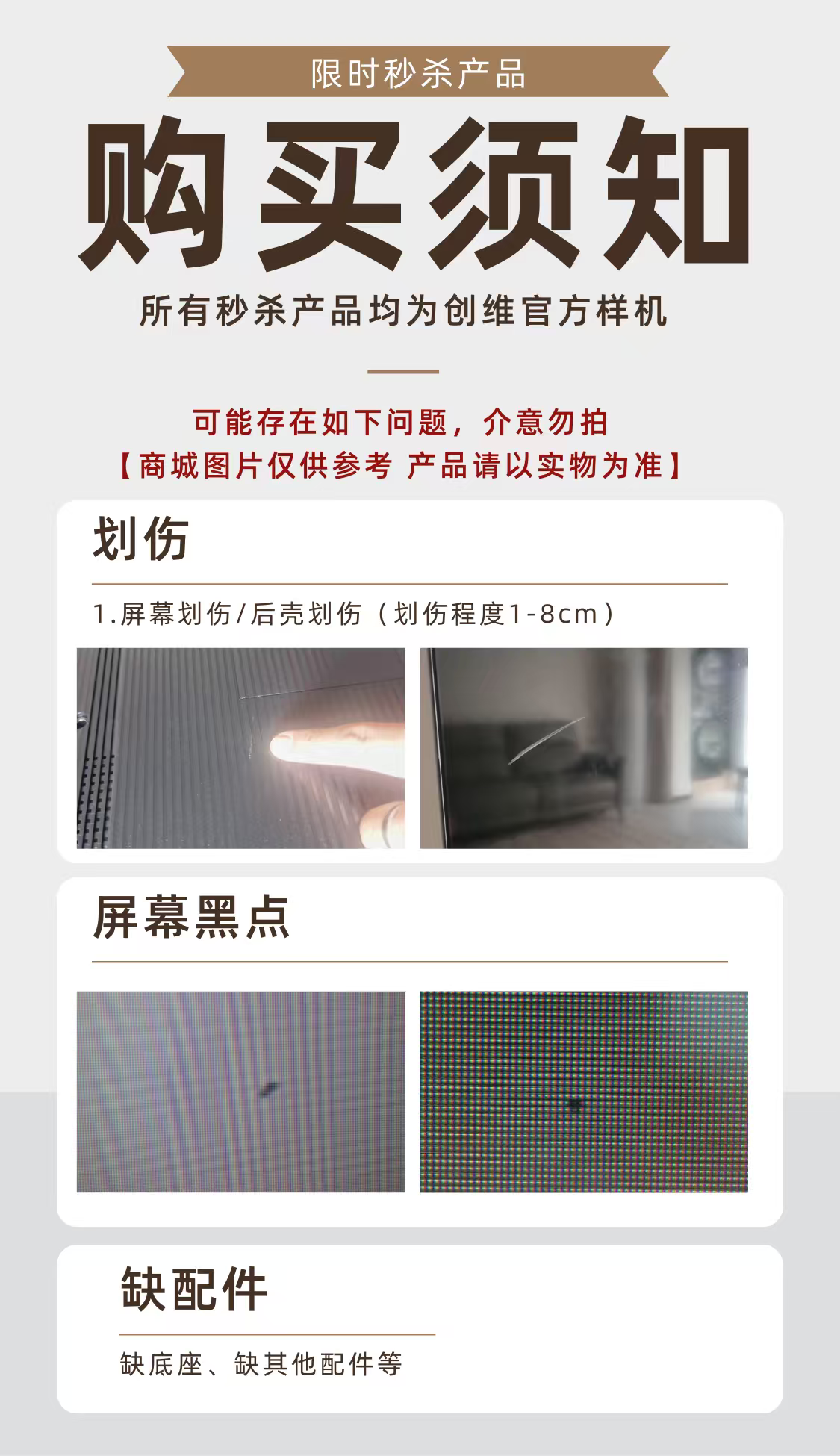 此商品为商场样机、运输磕碰机器等,都存在划伤、部分附件缺失,发生屏破碎的情况直接拒收,收货时务必24小时内开箱接通电源验货,超时效由收货人承担;保修1年不退不换,介意勿拍。