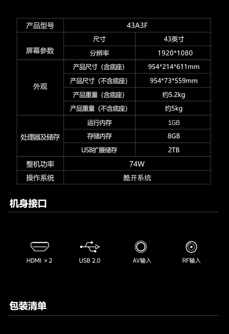 创维电视 43A3F 高清全面屏 护眼防蓝光 远场语音 43英寸